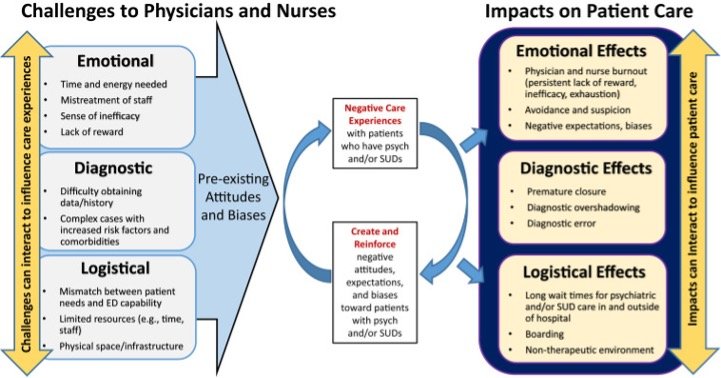 Figure citation: Isbell, L. M., Chimowitz, H., Huff, N. R., Liu, G., Kimball, E., & Boudreaux, E. (2023). A Qualitative Study of Emergency Physicians' and Nurses' Experiences Caring for Patients With Psychiatric Conditions and/or Substance Use Disorders. Annals of emergency medicine, 81(6), 715–727. https://doi.org/10.1016/j.annemergmed.2022.10.014