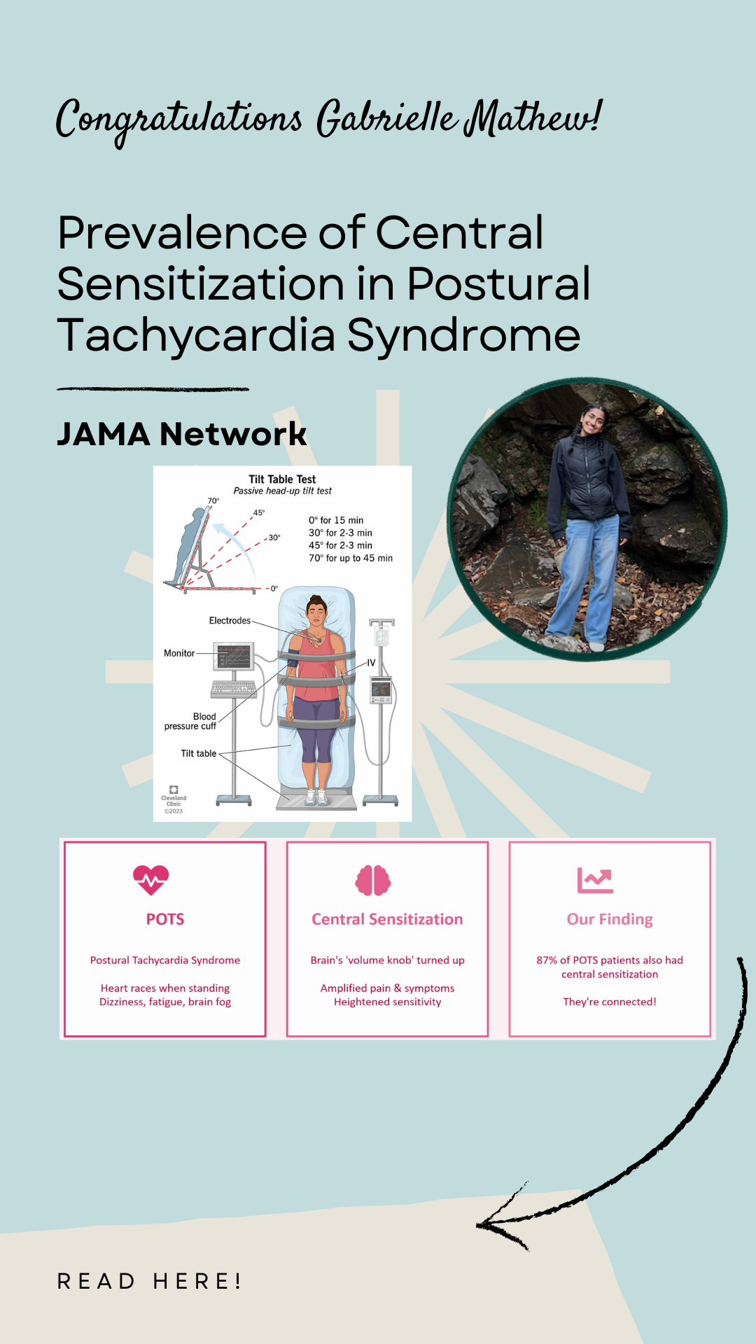 Congratulations to Gabrielle Mathew for her latest publication, Prevalence of Central Sensitization in Postural Tachycardia Syndrome, in JAMA Network! To read the full article, please click this link.